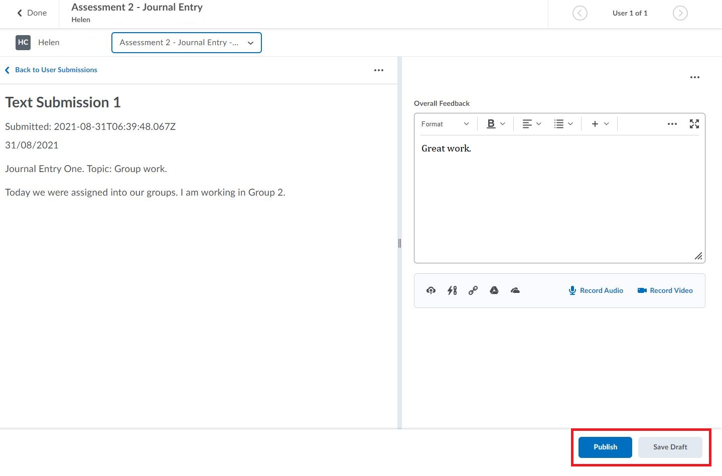 Submissions should be saved as draft until moderation is complete. - Publish ( the student will see their mark and the grade will be transferred to the grade book)